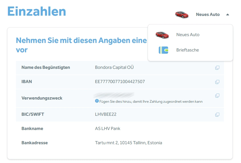 Zum aktuellen Zeitpunkt kannst keine Kreditkarten für Ein- und Auszahlungen benutzen. Diese müssen zwingend mit einem Bankkonto gemacht werden. Nutzt du Wise* oder Revolut*, kannst du jedoch diese Accounts per Kreditkarte aufladen, wenn du möchtest. Danach kannst du den Transfer zu Bondora hierüber durchführen. Funktioniert wunderbar und mache ich seit Jahren.
