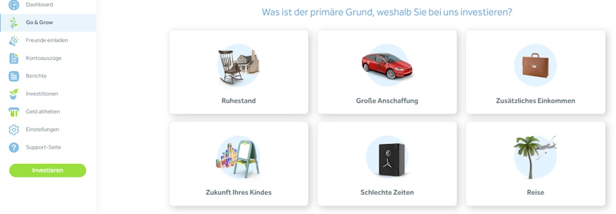 Geld einzahlen ist kinderleicht. In deinem Account siehst du eine Schaltfläche “Investieren”. Drückst du auf diese, bekommst du Überweisungsdaten angezeigt, die du nutzen kannst. Ich habe mir hierfür beispielsweise eine Auftragsvorlage bei meiner Hausbank angelegt. Auf die Go & Grow Konten kannst du auch direkt überweisen.