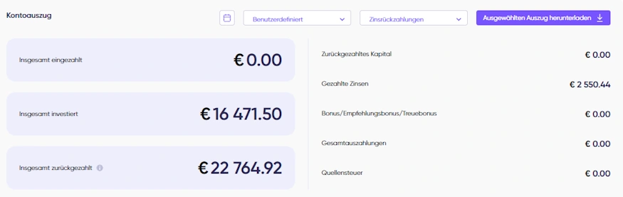 Highlight ist aber wohl das “Auto withdrawal” Feature, mit dem ihr verdiente Zinsen monatlich auszahlen lassen könnt. Damit geht euer Investment noch mehr in Richtung “Passives Einkommen”. Dieses Feature könnt ihr jedoch erst nutzen, wenn ihr mindestens 10.000 EUR investiert habt.