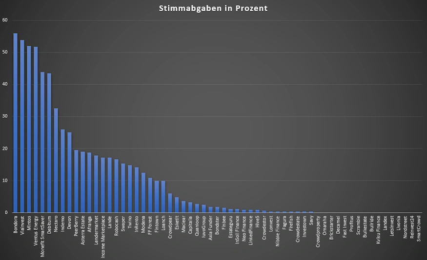 Einmal im Jahr frage ich unsere Community nach ihren 5 besten P2P Plattformen. 2025 hat LANDE hier mit 17,2% aller Stimmen den 14 von 61 Plätzen belegt, was als ein gutes Ergebnis gewertet werden kann.