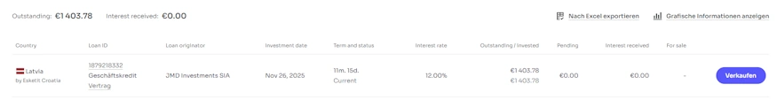 Für mich ist das ein solides Signal und man hat einen praktikablen Weg eingeschlagen, um das Problem zu entschärfen. Anleger können wieder klarer einschätzen, woran sie sind und Esketit scheint verstanden zu haben, dass Ruhe nur mit belastbaren Entscheidungen zurückkehrt. Da meine Kredite ohnehin noch alle bis nächstes Jahr in Irland laufen, habe ich jetzt erstmals auch über die kroatische Firma wieder Kredite gekauft und damit das Investment wieder aufgenommen.