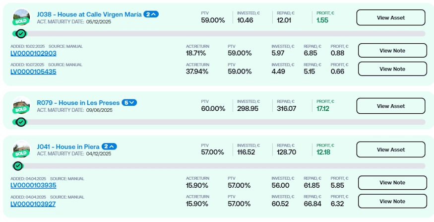 Noch stärker fiel die Rückholung von J038 in Madrid aus. Hier wurden 111.636,14 Euro zurückgezahlt und 1.534 Anleger profitierten. Die durchschnittliche Rendite lag bei 16,58 Prozent. Mein persönlicher ROI bewegte sich je nach Note zwischen 18,71 und 37,94 Prozent. Gelistet war der Fall seit Dezember 2024 und wurde nun ebenfalls erfolgreich geschlossen.
