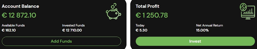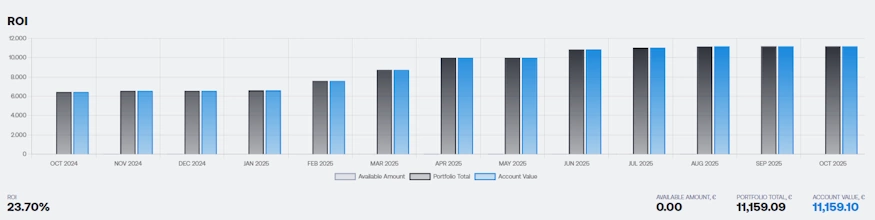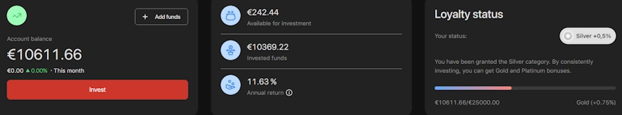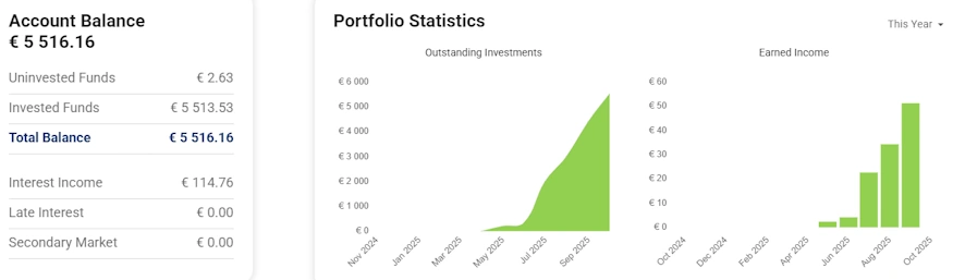 Nachdem ich bereits von 2021 – 2023 auf der alten Plattform erfolgreich investiert gewesen bin (damals jedoch in kleinerem Rahmen), ist Afranga nun zurück im Portfolio und wird diesmal größer ausgebaut. Wie bei allen anderen Plattformen auch, ist das Ziel hier mindestens 10.000 EUR und die 100 EUR Zinsertrag im Monat. Diese sollte ich recht schnell erreichen. Vermutlich ebenfalls im nächsten Quartal, ansonsten im ersten Quartal 2026.