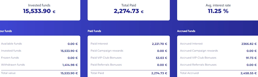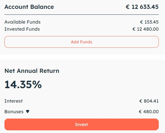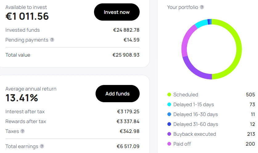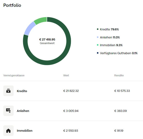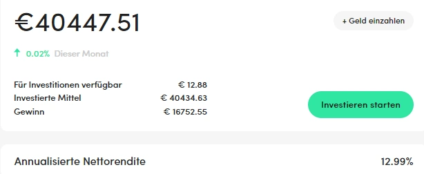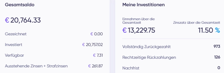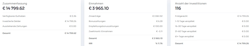 Mit 2,89% Rendite nach Währungsschwankungen befindet sich AxiaFunder noch auf einem enttäuschend niedrigen Niveau trotz guter Ergebnisse in den einzelnen Fällen. Ich bin gespannt, ob hier noch ein bisschen mehr geht, denn die Rückzahlung wird, wie beim letzten Mal schon angemerkt, sicher noch bis weit in 2026 laufen, wenn nicht sogar bis 2027. Ich erwarte jedoch keine großen Probleme.