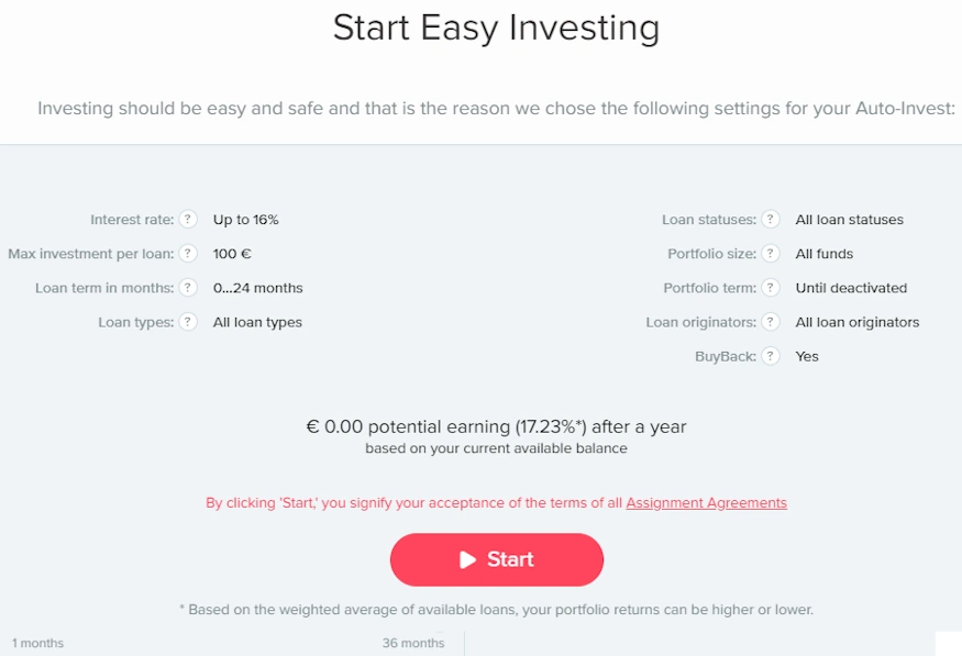 Während der Swaper Auto Invest schon relativ einfach zu bedienen ist, ist es bei Easy Investing noch einfacher. Hier drückst du einfach nur auf “Start” und sofern genug Geld auf deiner Seite und genug P2P Kredite aus Swapers Seite verfügbar sind, wird dein Geld nach den Vorgaben Swapers investiert. Genau das ist auch der Nachteil: du hast keinerlei Einstellmöglichkeiten, dafür eben auch keine Arbeit.
